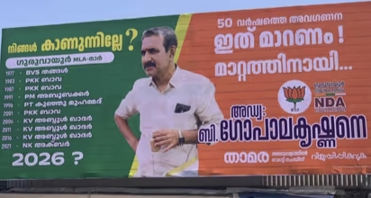ഗുരുവായൂർ : തൃശൂർ: നിയമസഭാ തിരഞ്ഞെടുപ്പ് പ്രചാരണത്തിന്റെ ചൂട് ഉയരുന്നതിനിടെ ഗുരുവായൂരിൽ വീണ്ടും രാഷ്ട്രീയ വിവാദങ്ങൾക്ക് വഴിവെച്ച് എൻഡിഎ സ്ഥാനാർത്ഥി B. Gopalakrishnan സ്ഥാപിച്ച ഫ്ലെക്സ് ശ്രദ്ധാകേന്ദ്രമായി. 1977 മുതൽ ഗുരുവായൂർ നിയോജക മണ്ഡലത്തിൽ വിജയിച്ച എംഎൽഎമാരുടെ പേരുകൾ നിരത്തി, അതിന്റെ അവസാനം “ഇതു മാറണം… മാറ്റത്തിനായി ഗോപാലകൃഷ്ണന് ഒരു വോട്ട്” എന്ന സന്ദേശം ഉൾപ്പെടുത്തിയ ഫ്ലെക്സാണ് നഗരത്തിലെ പ്രധാന കേന്ദ്രങ്ങളിൽ പ്രത്യക്ഷപ്പെട്ടത്.